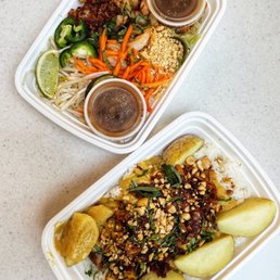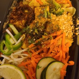 Vegetarian/vegan reviewer: I've ordered a couple of times from this place and I've liked it all the times. Be sure to check the shellfish allergy box/ mention it you vegetarians. 1. Tofu spring roll Absolutely love this simple and quick eat dish. It's filling and is pretty tasty. Just that the sauce with it almost tastes like tamarind and not much peanutty- you might wanna ask for peanut sauce replacement. I love spring rolls with peanut sauce instead. 2. Garden box Pretty nice, so many customizations. 3. Tofu green curry dish I think I liked this one better than garden box - ah I don't remember very vividly, but the green curry sauces were spicier and more flavorful